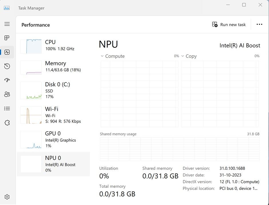 Một điểm thú vị khác là người dùng có thể dễ dàng kiểm tra về bộ xử lý thần kinh này trong phần Task Manager. Thay vì chỉ thấy thông tin về CPU, GPU và RAM, bạn sẽ thấy một phần riêng biệt cho NPU. Điều này giúp bạn theo dõi và kiểm soát hiệu suất của bộ xử lý AI một cách tiện lợi.