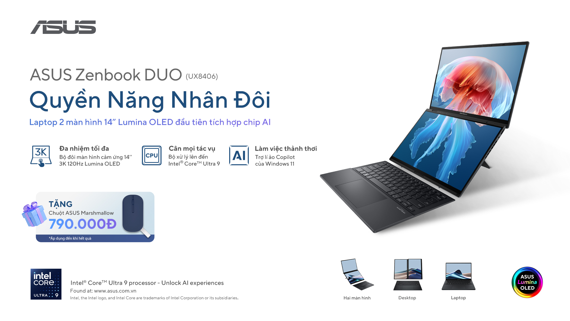 ASUS Zenbook DUO là mẫu laptop mới nhất trong dải sản phẩm laptop 2 màn hình của ASUS, nổi bật với thiết kế 2 màn hình cảm ứng ASUS Lumina OLED kích thước 14 inches, độ phân giải 3K, tần số quét 120Hz đi kèm với bàn phím tháo rời ASUS ErgoSense tích hợp touchpad và chân đế kickstand tích hợp giúp người dùng thoải mái sử dụng máy ở nhiều chế độ khác nhau: