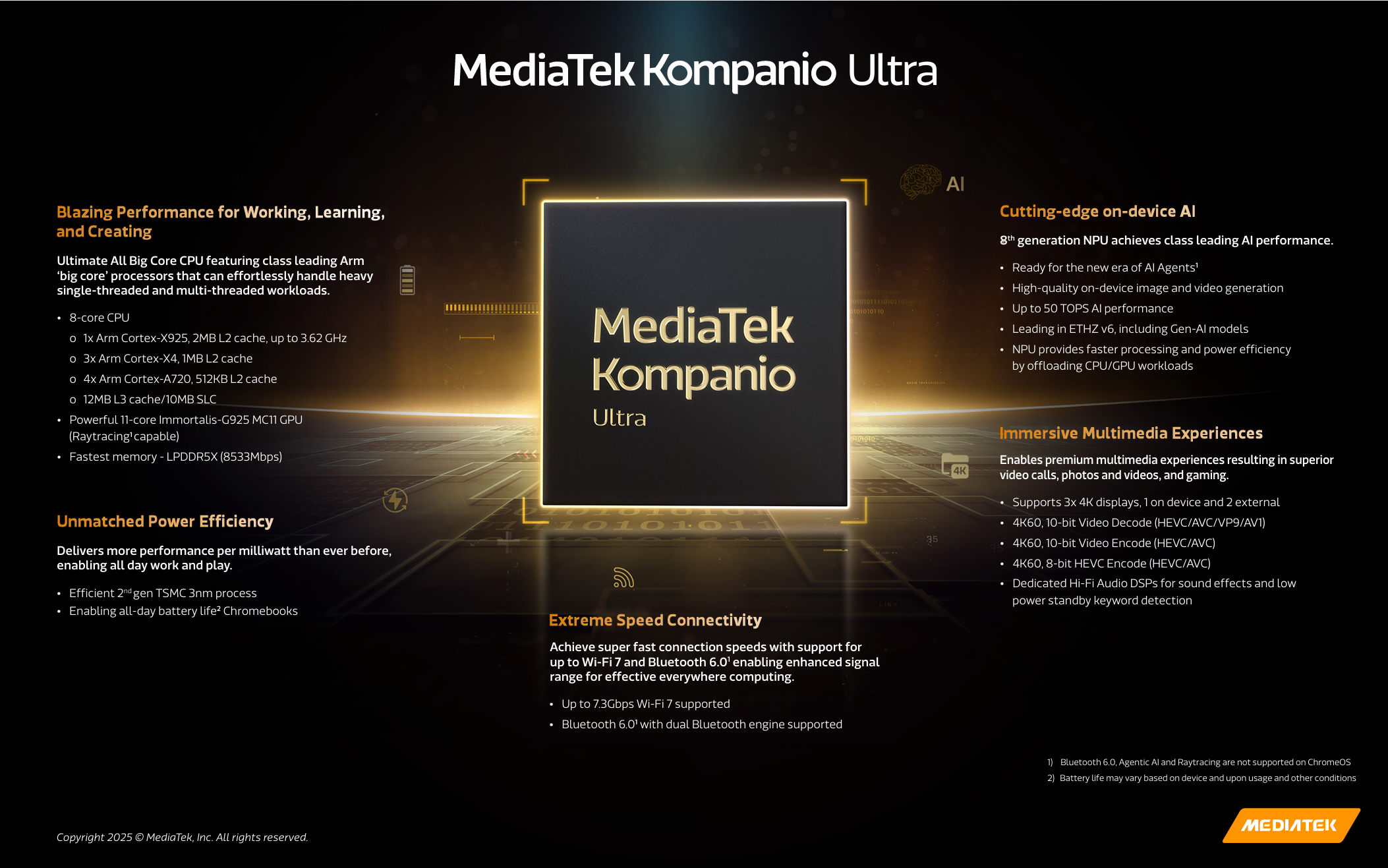 Hôm nay, MediaTek ra mắt Kompanio Ultra, đánh dấu một bước tiến mới trong lĩnh vực Chromebook hiệu năng cao, trang bị sức mạnh AI vượt trội. Phát huy thế mạnh và kinh nghiệm tiên phong của MediaTek trong việc đổi mới các sản phẩm flagship, nền tảng mạnh mẽ này mang đến những khả năng AI tích hợp ấn tượng trên thiết bị, hiệu suất điện toán vượt trội và hiệu quả năng lượng hàng đầu, dành cho cho các thiết bị Chromebook Plus mới nhất.