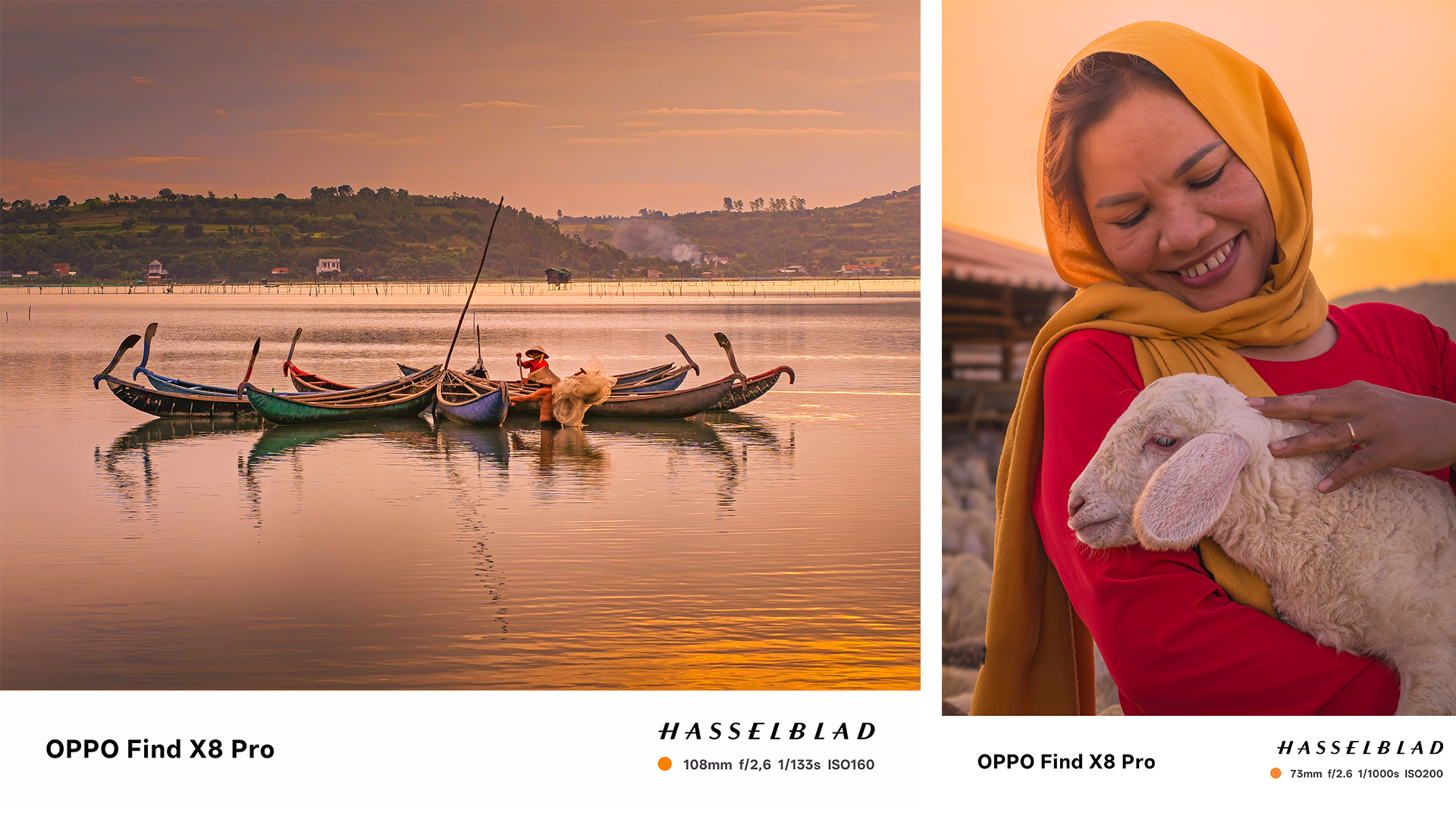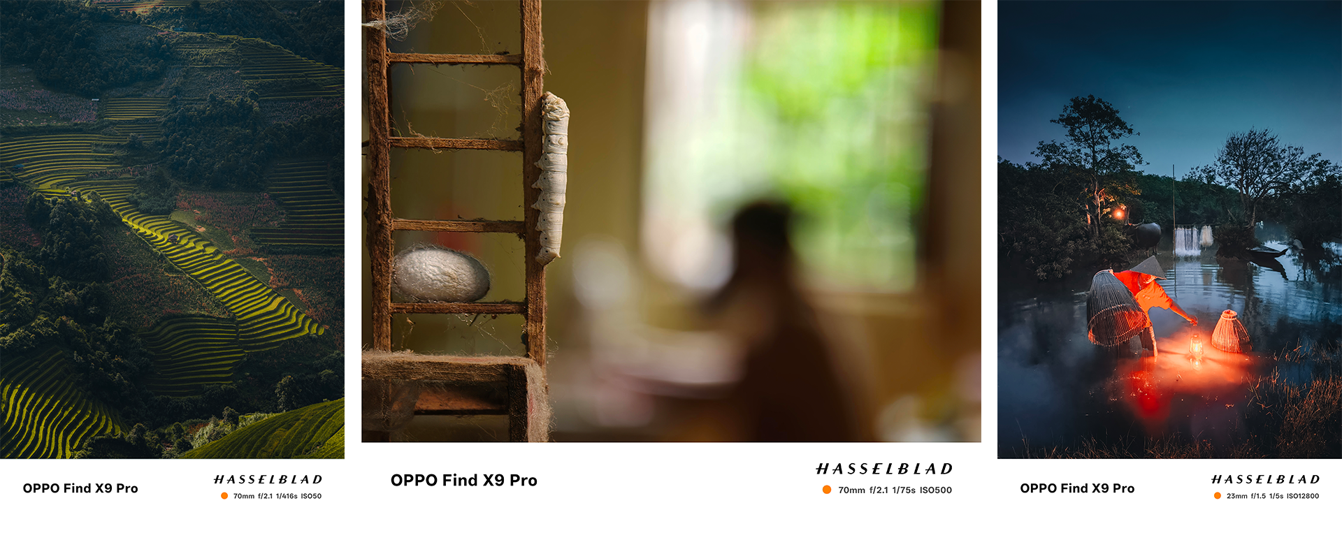 Bên cạnh đó, dự án còn giới thiệu nhiều câu chuyện ảnh đặc sắc từ khắp mọi miền Tổ quốc. Tại Mù Cang Chải (Yên Bái), bức ảnh “Lát Cắt Vùng Cao” đã phát huy sức mạnh của Camera Tele Hasselblad 200MP, giúp người xem vừa choáng ngợp trước sự hùng vĩ của những thửa ruộng bậc thang vàng óng, vừa nhìn rõ từng mái ngói đón nắng sớm đầy nên thơ. Xuôi về làng lụa Bảo Lộc (Lâm Đồng), bộ ảnh “Nghệ Nhân Nuôi Nghệ Nhân” của Nguyễn Đắc Đương sử dụng lăng kính tele macro độc đáo để kể câu chuyện song hành giữa con tằm và người thợ dệt. Tác giả khéo léo đặt hai chủ thể ở vị thế tương đương, xem cả hai đều là những “nghệ nhân” cần mẫn đang cùng nhau kiến tạo cái đẹp. Từ sợi tơ mỏng manh đến đôi tay chai sần kiên nhẫn, mỗi khung hình khắc họa một sự giao hòa trọn vẹn – khi nhịp thở của thiên nhiên và con người hòa quyện làm một. Trong khi đó, tại Đầm Rú Chá (Phá Tam Giang, Huế), khu rừng ngập mặn nguyên sinh lớn nhất Đông Nam Á, album “Đèn Treo Bến Nước” của nhiếp ảnh gia Nguyễn Khánh Vũ Khoa đã khai thác triệt để tính năng Chụp Đêm Chuyên Nghiệp để truyền tải câu chuyện xúc động về những đêm mưu sinh của những con người bé nhỏ tại đây. Một ánh đèn nhỏ lại là nguồn sống mạnh mẽ cũng đủ sức soi sáng cả nếp sinh hoạt vùng sông nước, nơi từng giọt mồ hôi thầm lặng giữ cho nhịp sống Phá Tam Giang vẫn rạng rỡ giữa màn đêm.