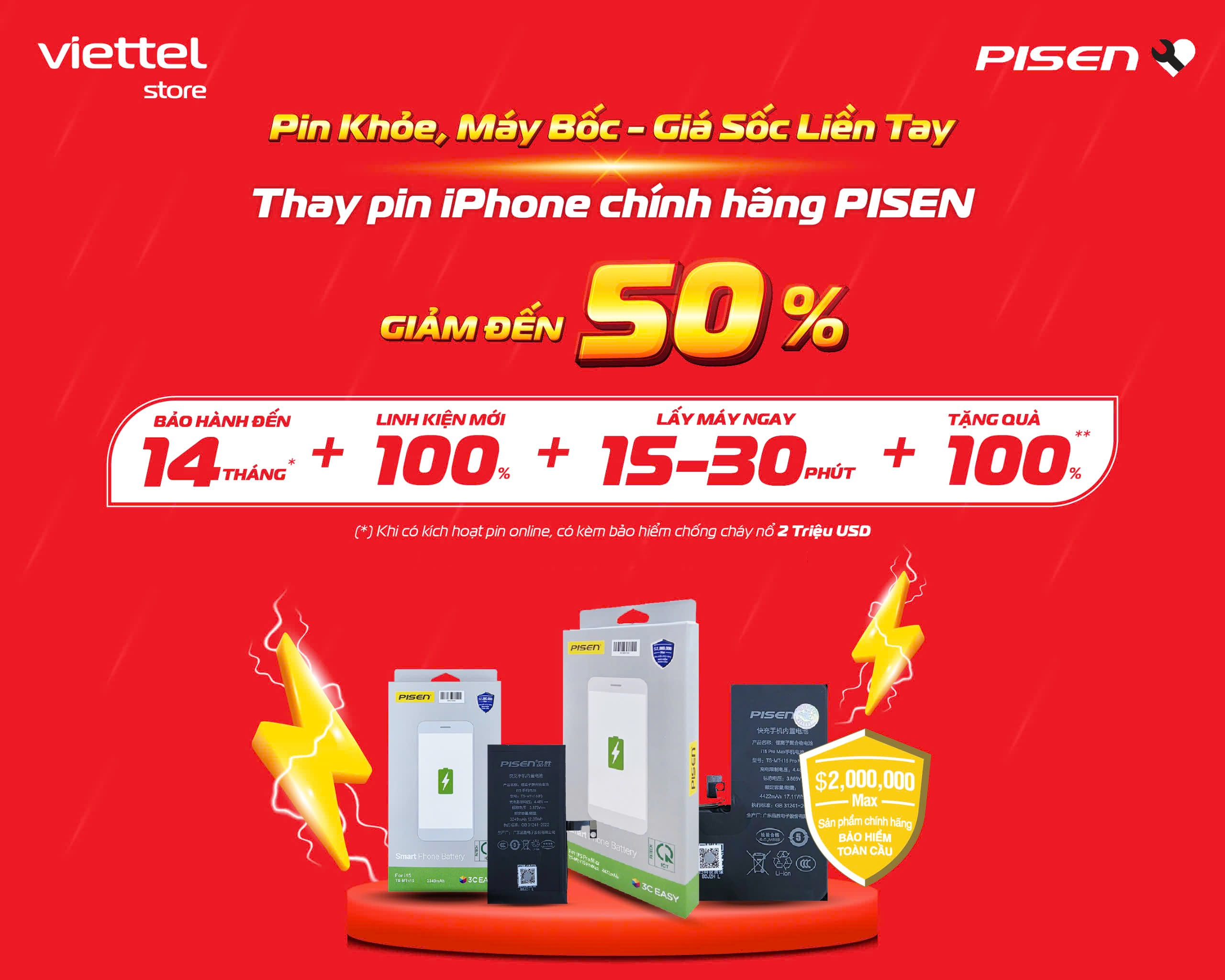 Pisen là thương hiệu công nghệ có mặt tại hơn 150 quốc gia, với hơn 20 năm kinh nghiệm trong lĩnh vực sản xuất pin, màn hình và phụ kiện công nghệ đạt tiêu chuẩn quốc tế. Với sự hợp tác này, Viettel Store cam kết mang đến cho khách hàng giải pháp thay pin chính hãng – bền bỉ – an toàn, đi kèm bảo hiểm trách nhiệm lên đến 2 triệu USD để đảm bảo tối đa quyền lợi của người dùng.