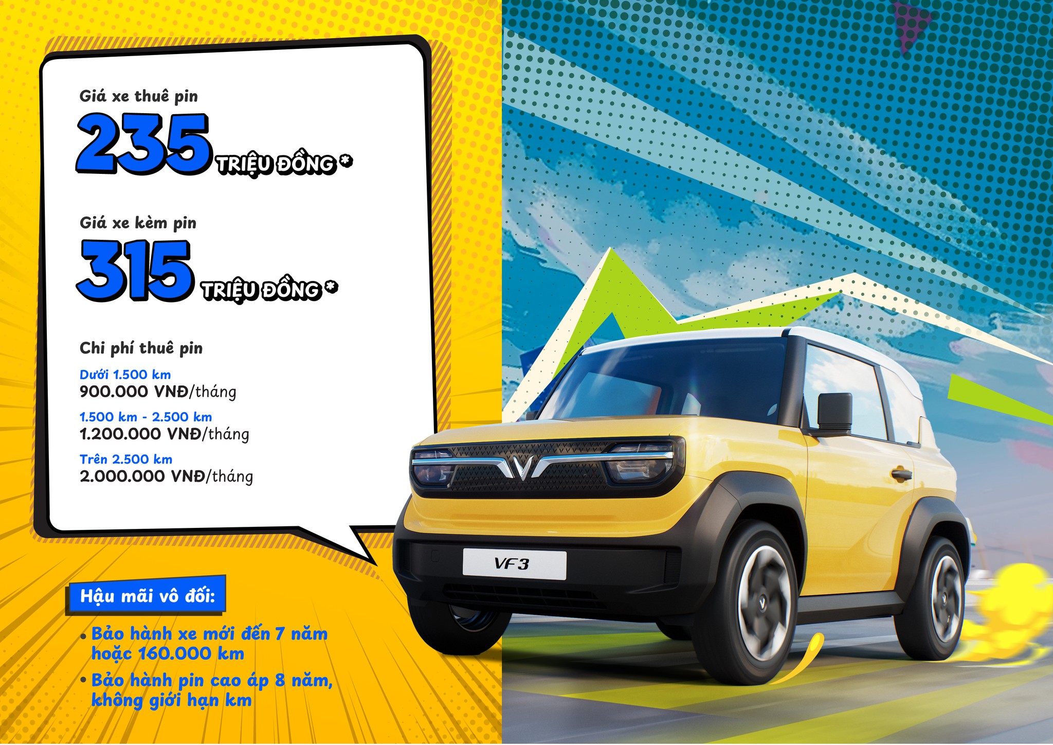 Sức hút của VF 3 đến từ mức giá đặc biệt chỉ 235 triệu đồng (thuê pin) và 315 triệu đồng (kèm pin) áp dụng cho các khách hàng đăng ký từ 06h00 ngày 13/5 đến hết ngày 15/5/2024. Đây là mức giá lý tưởng, tạo điều kiện cho đông đảo người dân sở hữu ô tô, nâng tầm chất lượng sống với kinh phí ban đầu rất hợp lý. Cụ thể, khách hàng chỉ cần đối ứng từ 50-70 triệu đồng, số tiền còn lại sẽ được hỗ trợ vay và trả góp với tổng gốc và lãi hàng tháng chỉ hơn 2 triệu đồng trong vòng 8 năm. Trường hợp khách hàng thanh toán toàn bộ, chi phí mua VF 3 cũng chỉ bằng một nửa so với mẫu ô tô xăng đang có giá thấp nhất trên thị trường hiện tại.