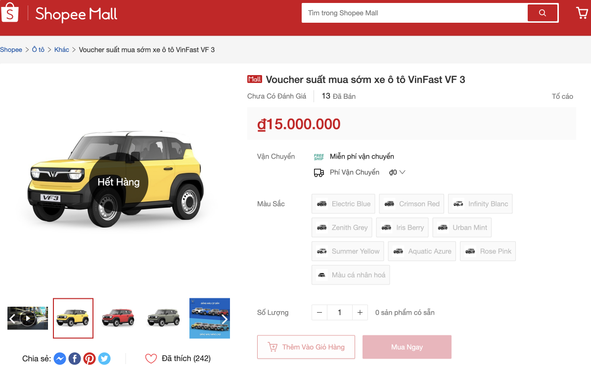 Bên cạnh sức hút về giá, doanh số kỷ lục của VinFast VF 3 cũng đến từ sự đột phá trong phương thức bán hàng. Lần đầu tiên tại Việt Nam, sản phẩm ô tô được giao dịch trên các nền tảng thương mại điện tử như Shopee, VinID cũng như chốt đơn thông qua 9 phiên livestream do 15 người có ảnh hưởng với cộng đồng (KOLs) phối hợp thực hiện.