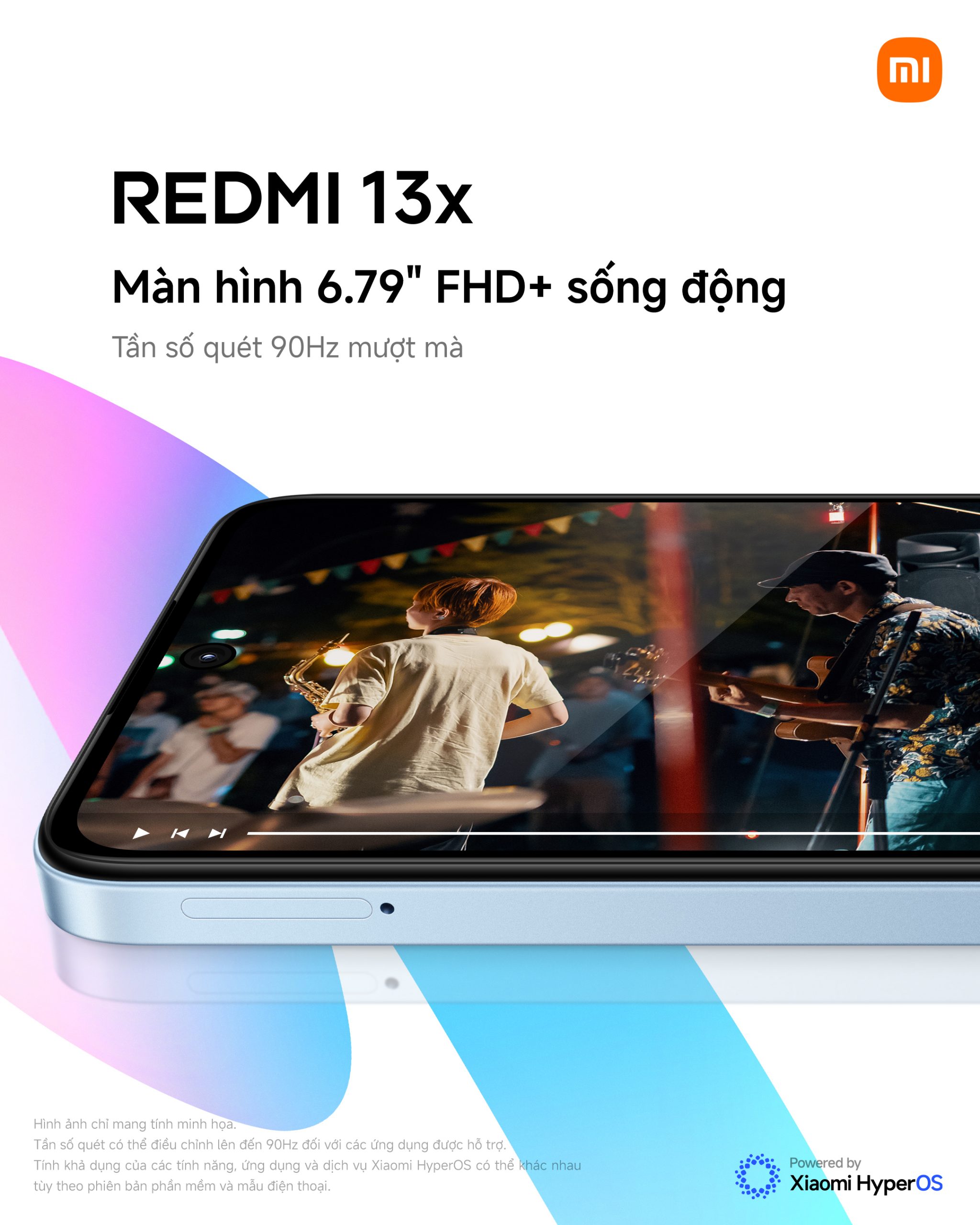 Redmi 13x trang bị màn hình rộng 6,79 inch với độ phân giải FHD+ DotDisplay, hỗ trợ hiển thị 16.7 triệu màu sắc sống động. Màn hình tự động điều chỉnh độ sáng theo ngữ cảnh sử dụng, giúp tiết kiệm pin và tối ưu trải nghiệm hiển thị. Tần số quét 90 Hz mang đến sự mượt mà trong mọi thao tác vuốt chạm.
