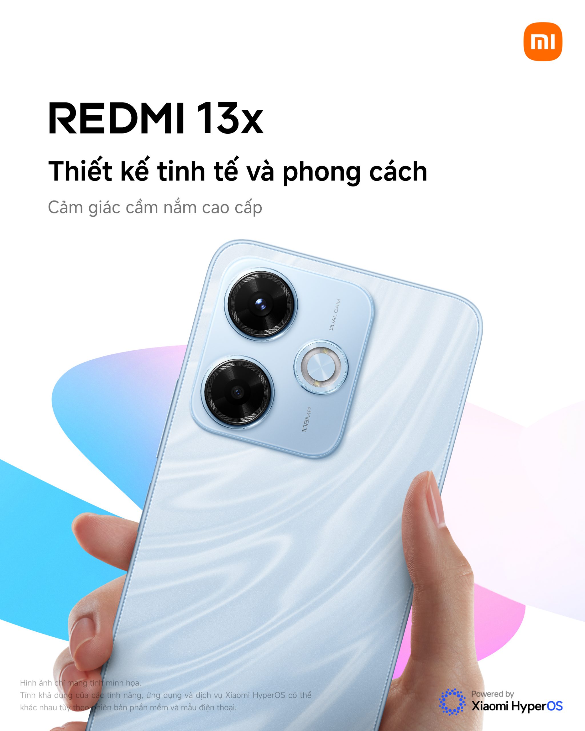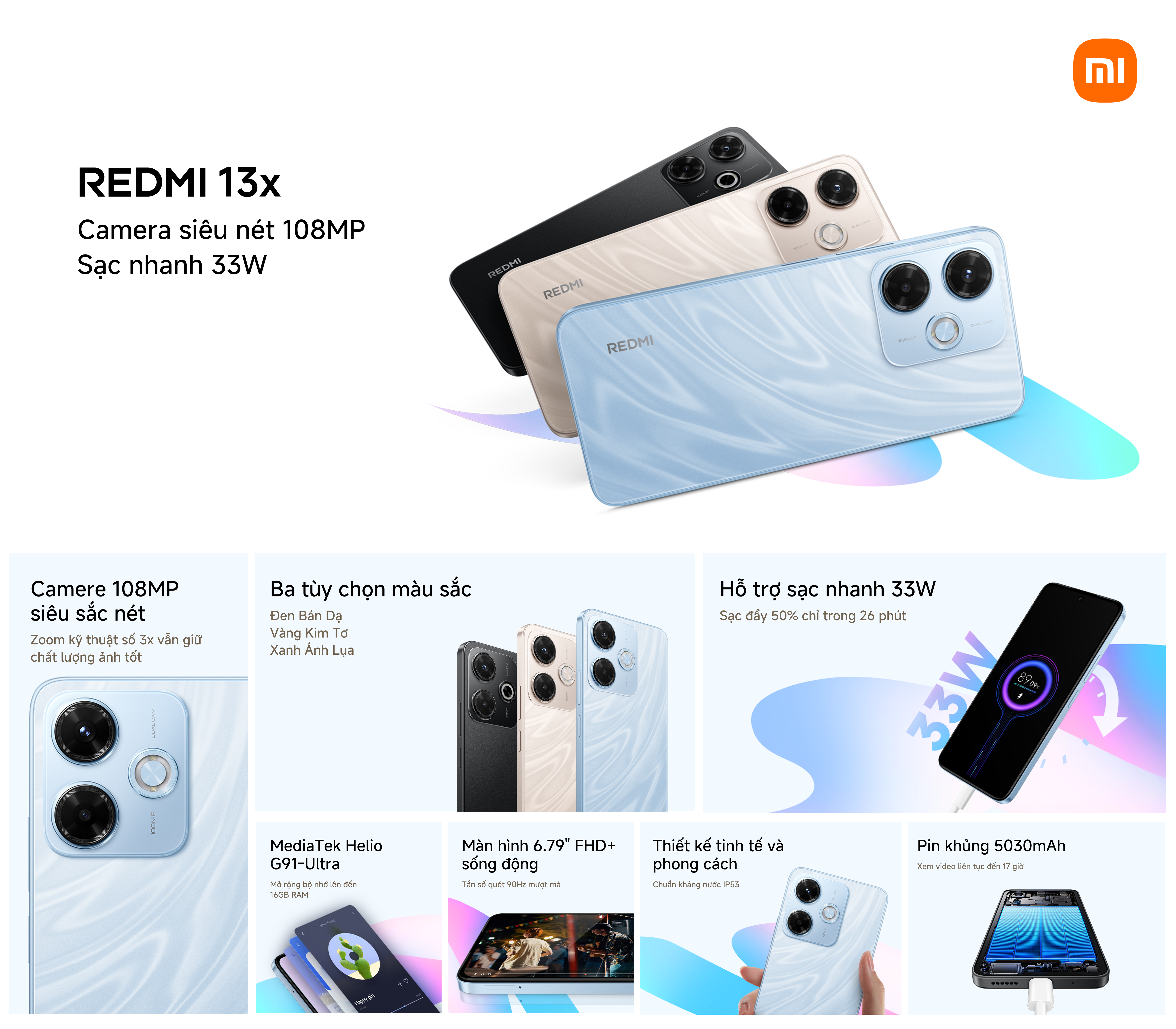Xiaomi chính thức giới thiệu Redmi 13x, mẫu smartphone mới thuộc dòng Redmi, với thiết kế thời thượng, camera siêu nét 108MP và hàng loạt tính năng thông minh, mang đến trải nghiệm toàn diện trong phân khúc phổ thông.