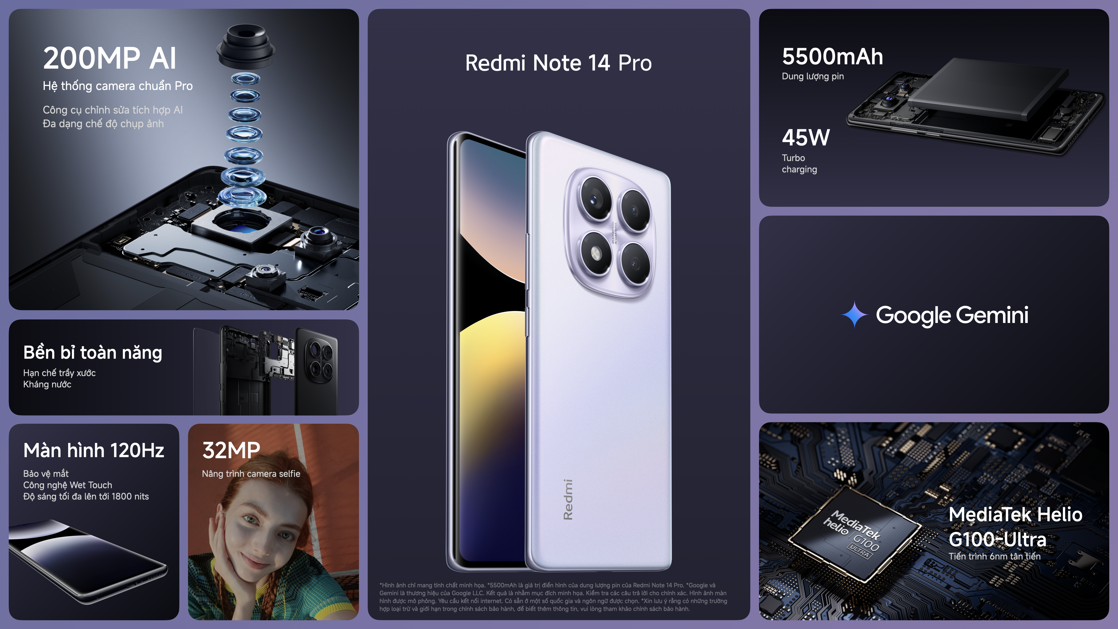 Các phiên bản còn lại như Redmi Note 14 Pro 5G, Redmi Note 14 Pro và Redmi Note 14 sở hữu vi xử lý MediaTek Dimensity 7300-Ultra, Helio G100-Ultra và Helio G99-Ultra, mang đến trải nghiệm mượt mà. Pin từ 5.110 đến 5.500 mAh, bền bỉ qua 1.600 lần sạc (4 năm). Tính năng Sạc thông minh và dự đoán lão hóa tối ưu quy trình sạc, giữ hiệu suất lâu dài. Các phiên bản cao cấp còn hỗ trợ tự động bật nguồn khi cắm sạc, tiện lợi cho người dùng.
