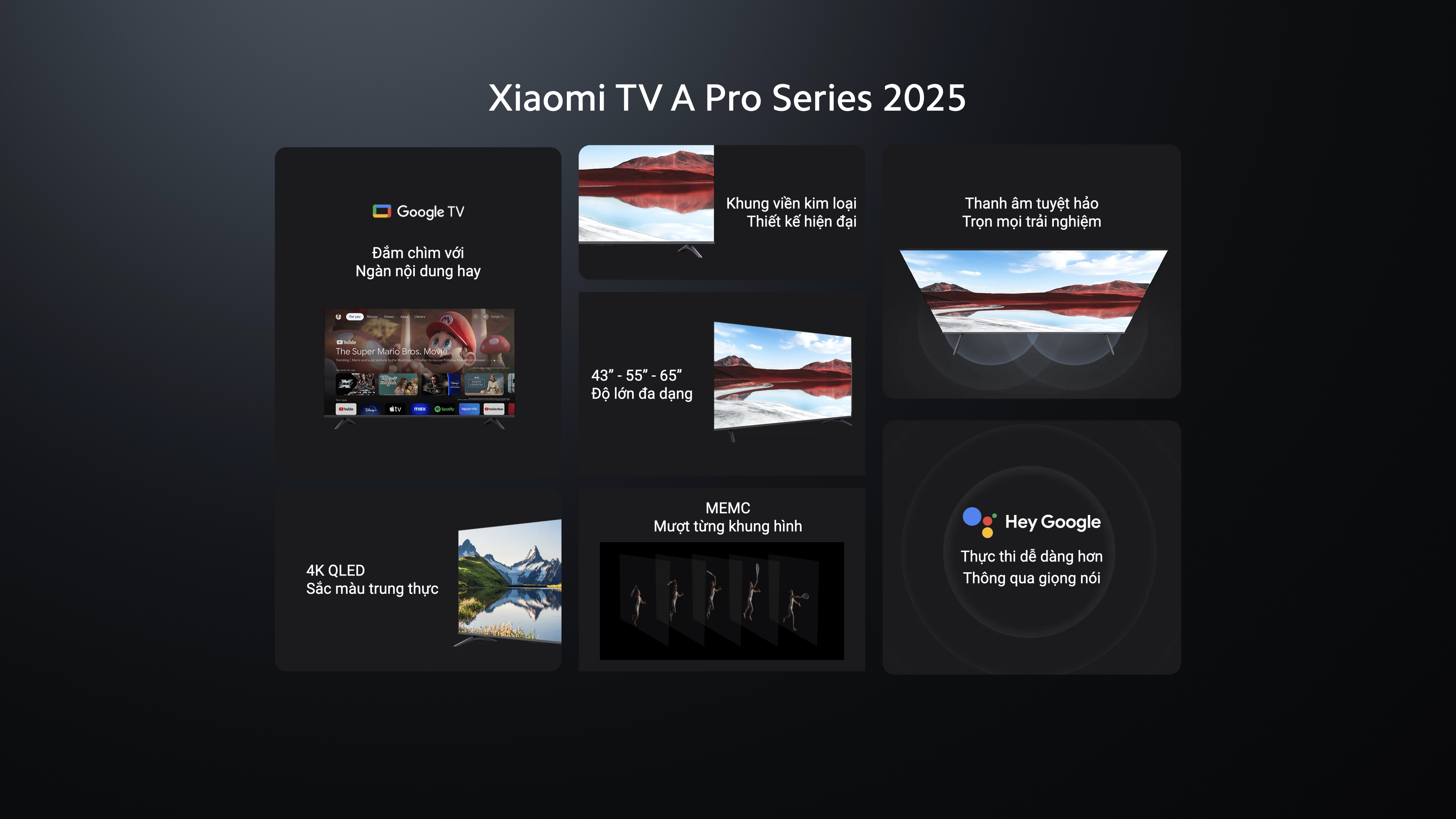 Xiaomi vừa cho ra mắt 2 dòng sản phẩm gia dụng cao cấp gồm Xiaomi TV A và Xiaomi TV A Pro phiên bản 2025. Bên cạnh việc sở hữu tấm nền chất lượng cao, thiết kế viền mỏng sang trọng và hiện đại, 2 dòng sản phẩm mới này còn được tích hợp công nghệ âm thanh từ Dolby Atmos và hệ điều hành Google TV giúp tối ưu trải nghiệm nghe nhìn của mọi thành viên gia đình.